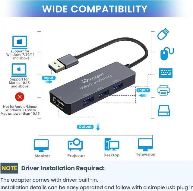 High performance chips with wide compatibility USB 3/USB A to HDMI With 3*USB3.0 HUB/usb video card, easily link your mouse, keyboard and other USB port devices for application expansion and data transmission,Everaging the high-bandwidth (5 Gbps) Super Speed USB 3.0 interface,Wide compatibility with multiple systems: Compatible for Mac and Windows, Both systems support extend and Mirror mode .This USB video adapter/hdmi extended display adapter extends the working area of the computer while improving the efficiency of the data.