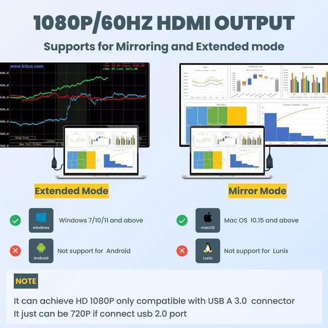 Extend your workspace with this usb to hdmi adapter Graphics Adapter Add additional monitors without expensive, internal video card, This USB A to HDMI adapter is used to connected USB device(computer, laptop, desktop) with HDMI devices (monitor, projector, TV) for multi-monitor solution,has extend mode let your laptop for visibility of multiple tasks at the same time; Mirror mode gives your laptop to a large screen for a visual enjoyment.