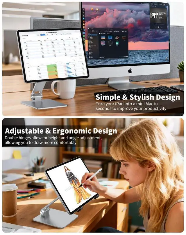 Fully Adjustable for Optimal Viewing & Workspace Efficiency: Easily adjust the height and angle of your iPad to create the perfect setup. Transform your iPad into a secondary display for enhance