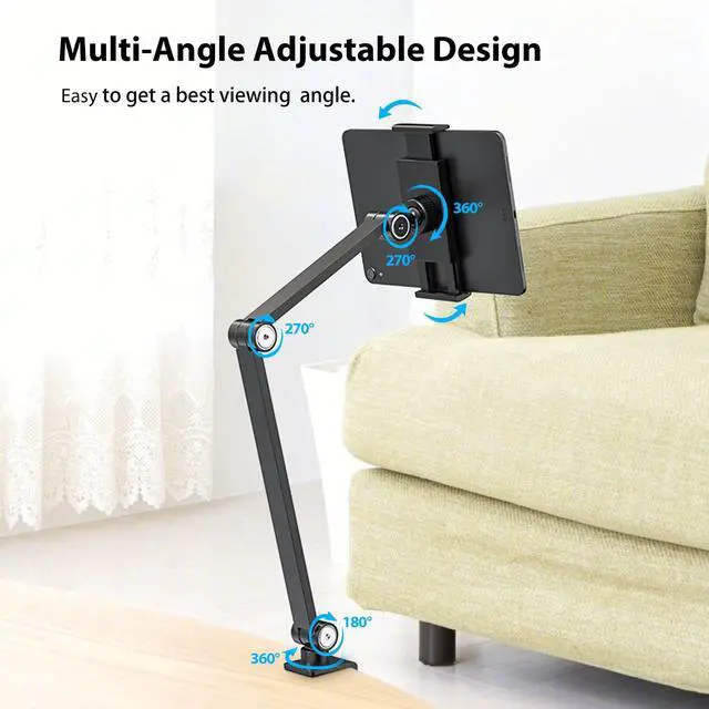 Adjustable: The tablet clamp holder has a maximum height of 15.15. The well crafted product comes with a 360° circulatory adjustment that provides you with a wide range of angles depending on your own preference. Easy to operate, enjoy your perfect visual experience. Note: Clamp adjustment range of 4.7-8.9 inches.