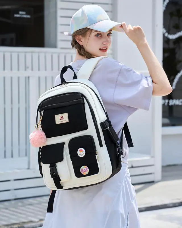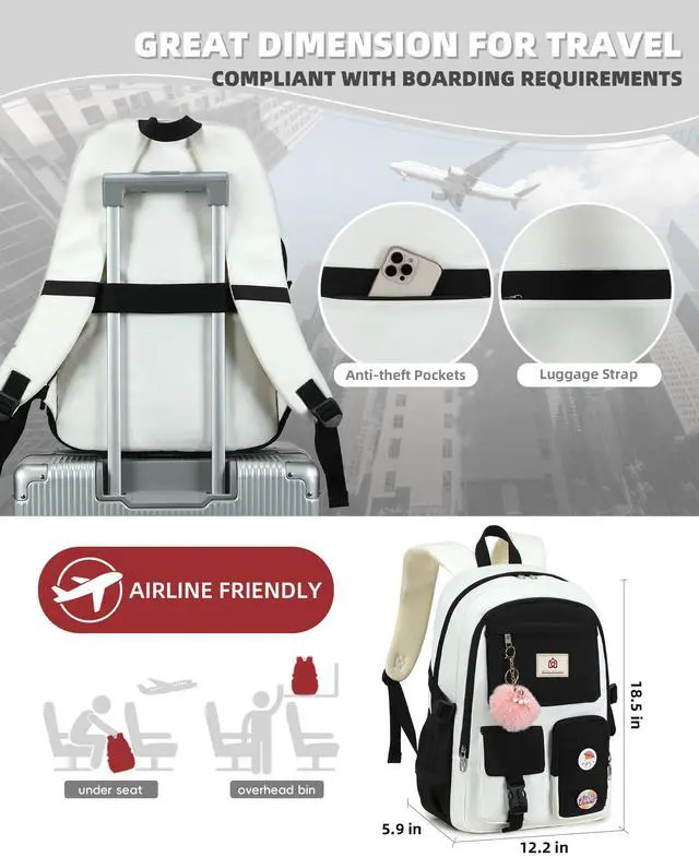 Spacious and Organized Design-School Backpack: This backpack for girls offers a 30 L capacity with 12 pockets for effortless organization.The backpacks for women has 5 separate different size pockets and two side pockets meet your daily storage. The front three pockets can hold charge device and other small items, convenient for your daily organization. The main pocket of includes laptop padded sleeve with elastic belt and hidden inner zipper pockets
