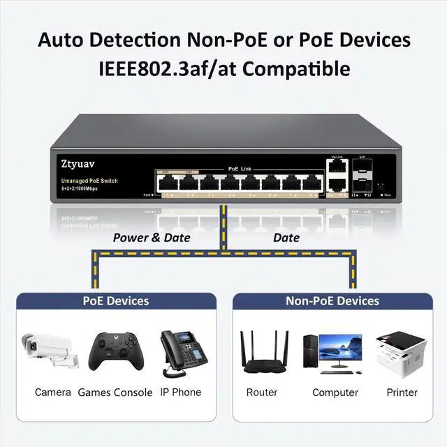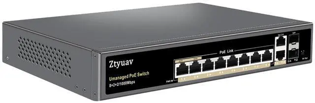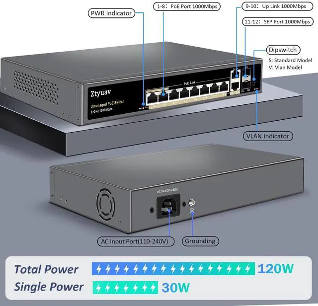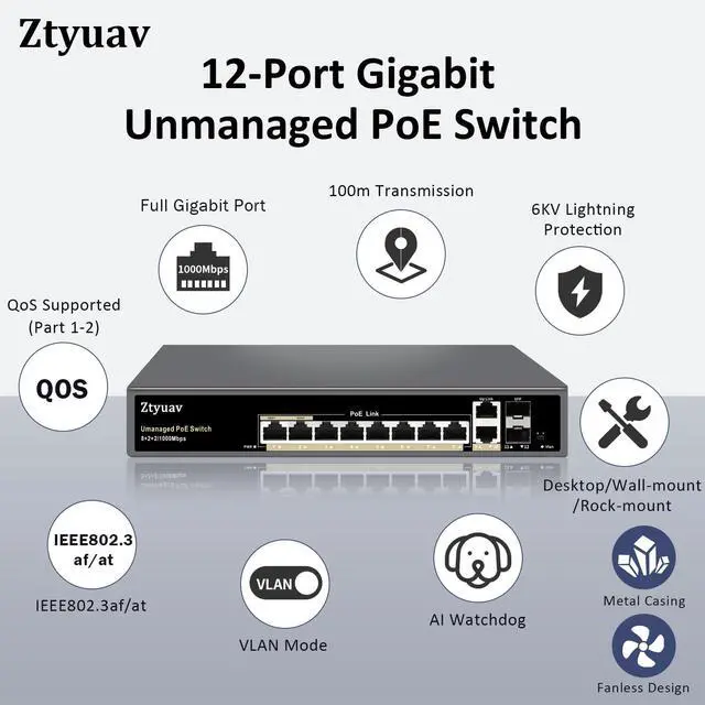 Ztyuav 12-Port Full Gigabit Unmanaged PoE Switch with 8 PoE+ Ports @120W, 2 Uplink and 2 SFP Slots-IEEE 802.3 af/at, QoS, PD Auto-Detection, VLAN Mode, Metal Fanless Network Switch Plug & Play