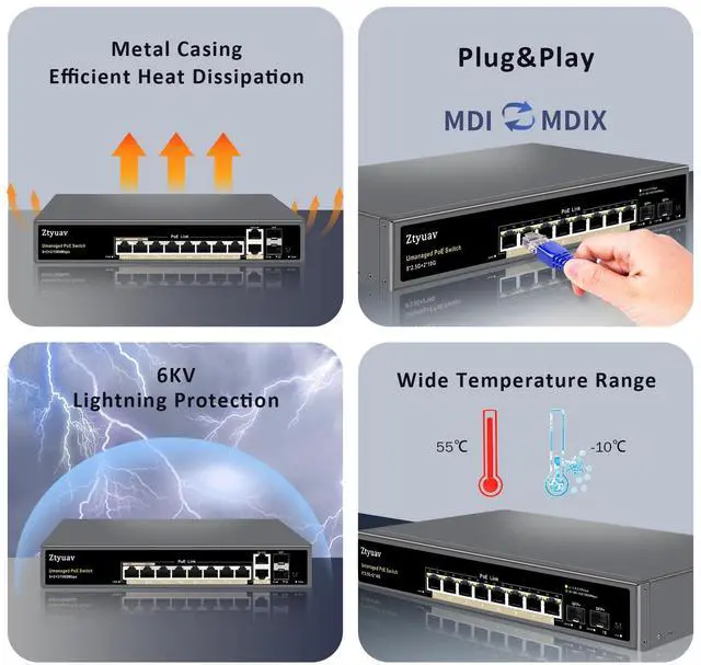 Standard PoE Switch: IEEE802.3af/at compatible and PD auto detection, which can automatically detect adaptive PoE devices and provide required power for them, while protect non-PoE devices from being damaged. And the switch provide 6KV lightning protection, withstand the impact of lightning strikes.