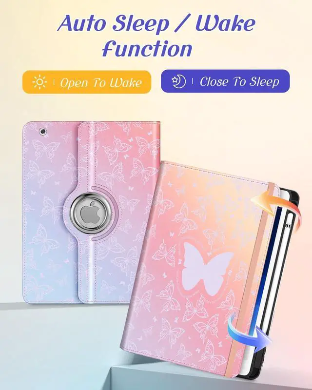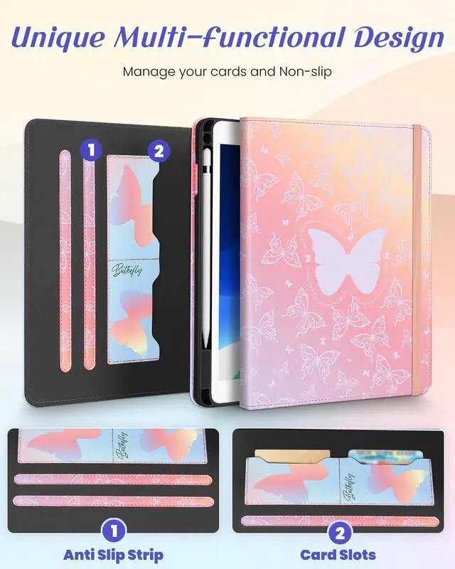 Kidcube for iPad 9th/8th/7th Generation Case 10.2 Inch - for Women Girls Kid Cute Rotating Stand Folio Cover with Pencil Holder & Card Slot Girly Kawaii Butterfly Design for iPad 9th/8th/7th Gen Cases