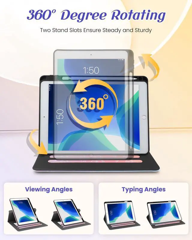360° Rotating Stand: This for iPad 9th/8th/7th case with an functional rotating stand design, supporting your devices to switch between landscape and portrait orientations. While 2 anti-slip strip design allow for multiple horizontal stand angles for comfortable viewing or typing