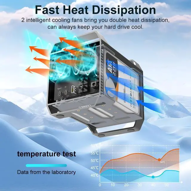 Efficient Heat DissipationThe MAIWO 4 Bay Hard Drive Enclosure features an aluminum alloy design and is equipped with 2 cooling fans for optimal heat dissipation. These fans automatically activate when your hard drive temperature exceeds 48, ensuring your 3.5 SATA HDDs are protected while maintaining energy efficiency. This makes our 4 bay DAS enclosure not only intelligent but also environmentally friendly.