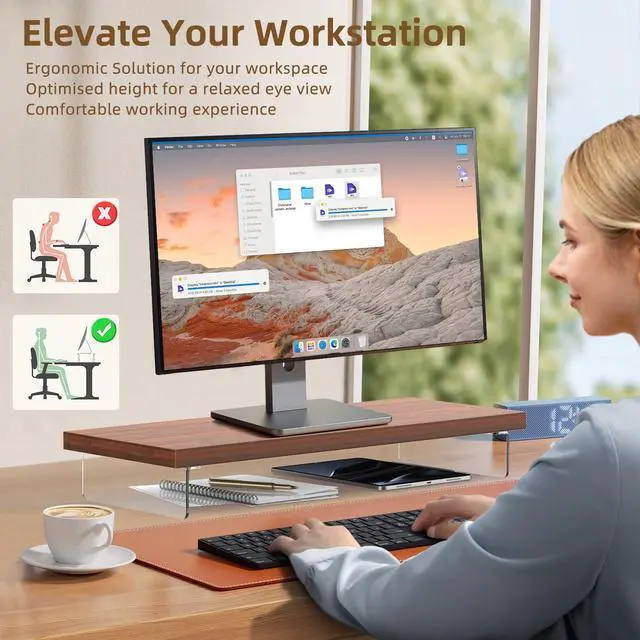 [Ergonomic Comfort] The monitor stand raises your monitor by 4 inches to align with eye level, reducing neck and back strain. The wooden construction offers an ideal viewing angle, maximizing productivity and comfort during long work sessions.