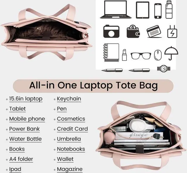 Ideal Organizer Work Tote:The work bags for women come with multi-compartments to meet all your work needs well. The laptop tote bag has an independent laptop compartment fits under 15.6 inch laptop and Ipad/tablet,a large main middle pocket designed for documents, book and gadgets,two small square pockets, two pen pockets,There has two side-pocket for power bank and water bottle inside.Stylish outer pocket with magnetic buckle,two zipper pockets and an anti-theft pocket,Easy access to items.