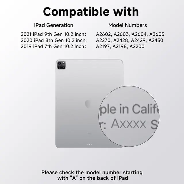 Compatibility: swivel ipad case with keyboard Perfectly designed for the iPad 9th Gen (2021, 10.2 inch) Models A2602 A2603 A2604 A2605; iPad 8th Gen (2020, 10.2 inch) Models A2270 A2428 A2429 A2430; iPad 7th Gen (2019, 10.2 inch) Models A2200 A2197 A2198; Prior to purchase, verify the iPad model number (denoted by the prefix "A" on the device's rear casing) to ensure compatibility.