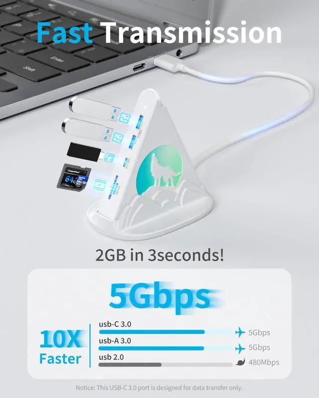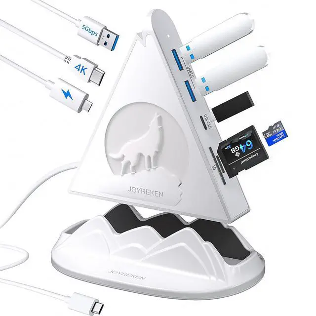 8-in-1 White USB-C Hub with RGB: Equipped with a 4K@30Hz HDMI port, a 5Gbps USB-C data port, three 5Gbps USB-A 3.0 ports, support for 100W PD charging, and an SD/MicroSD card reader. Additionally, its dynamic RGB lighting enhances the ambiance for gaming or home movie nights. Boasting a sleek, minimalist design, this white USB hub serves as an all-in-one solution to keep your desk tidy.
