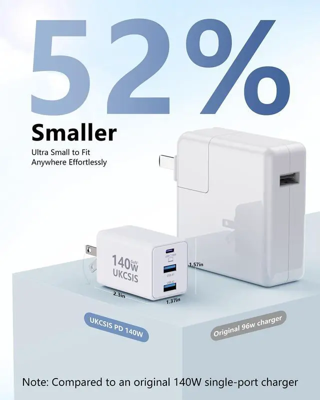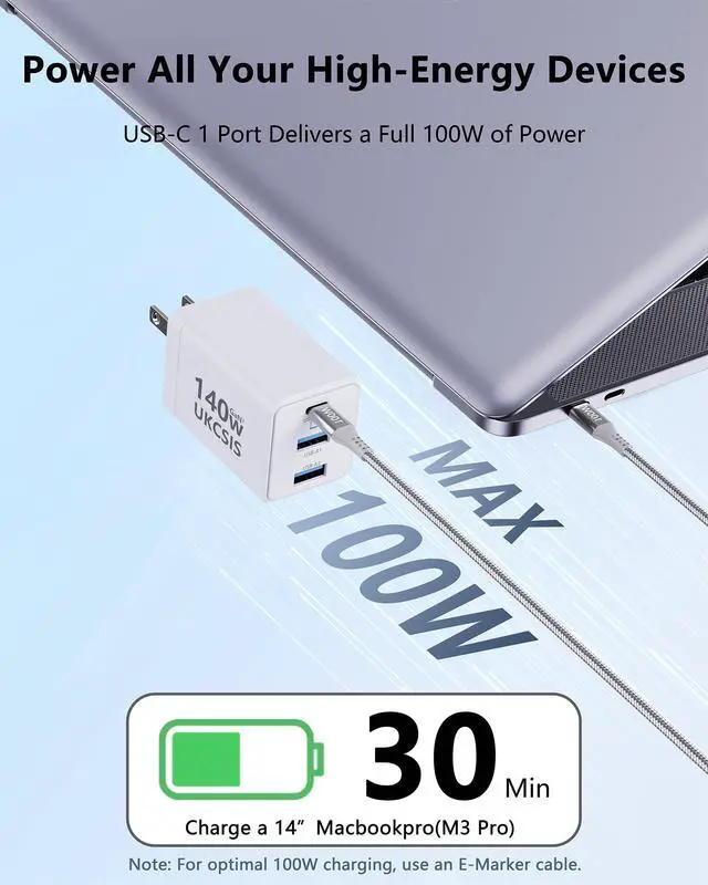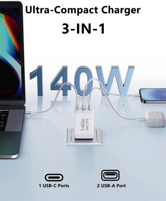 140W Ultra-Fast Charging for All Devices: USB C Laptop Charger Power up to three devices at once with our 140W charger. USB-C port delivers up to 100W, charging your MacBook Pro 14" to 60% in just 30 minutes. Whether it's your laptop, phone, tablet, or other gadgets, this compact, powerful charger provides fast speeds and reliable safety with advanced protection features. Say goodbye to slow charging!