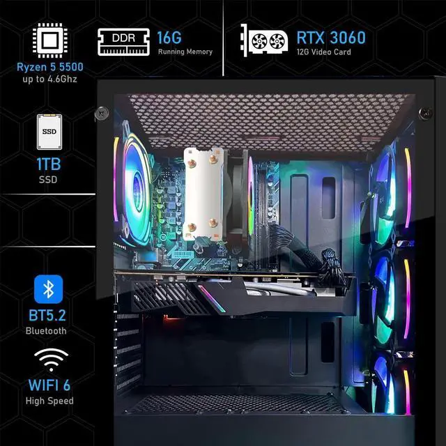 STGAubron Gaming PC Computer Desktop, AMD Ryzen 5 5500G up to 4.2G, GeForce RTX 3060 12G, 16G DDR4, 1T SSD, WiFi 6, BT 5.2, RGB Fan x4, Windows 11 Home