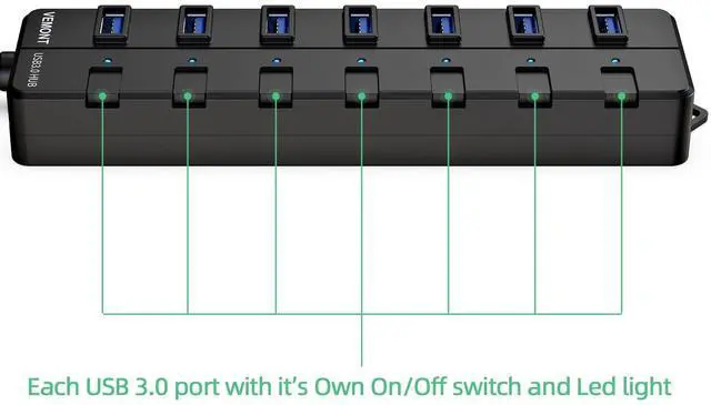 VEMONT USB hub,Computer Peripheral Equipment 7-Port USB 3.0 hub with 5V2A Power Adapter and Individual On/Off Switches,USB Charging hub 4ft/1.2m Long Cable