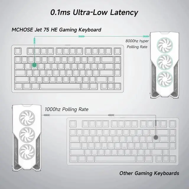 0.1ms Ultra-Low Latency: MCHOSE JET 75 Gaming Keyboard delivers a true 8000Hz polling rate and a 128K scan rate, achieving ultra-low 0.1ms latency. Powered by our custom high-frequency, Esports-level chip and Algorithm 2.0, every press is faster and more precise