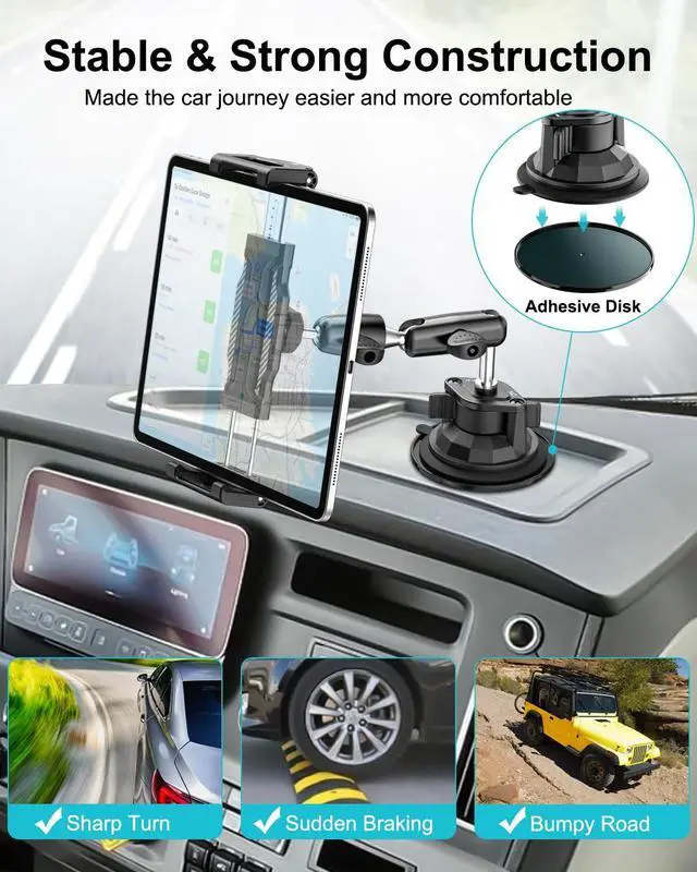 Durable Vacuum Suction CupHeavy Duty Suction Cup Tablet Holder is equipped with a strong vacuum suction cup (diameter: 3.38 inches/8.6 cm) . One-touch rotation to lock the suction cup base, can securely attaches to windshield. It can be firmly fixed on the car even on bumpy roads. Use for dashboard - For added suction cup stability, use the included adhesive disk for semi-permanent mounting on dash.
