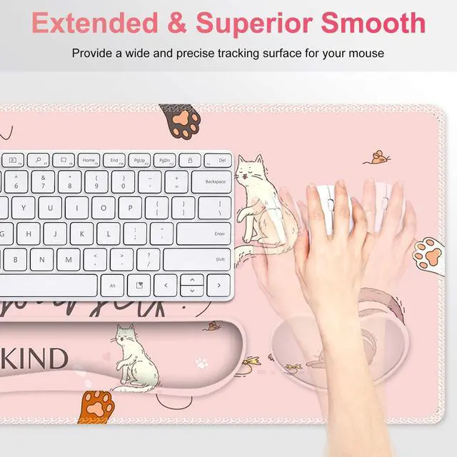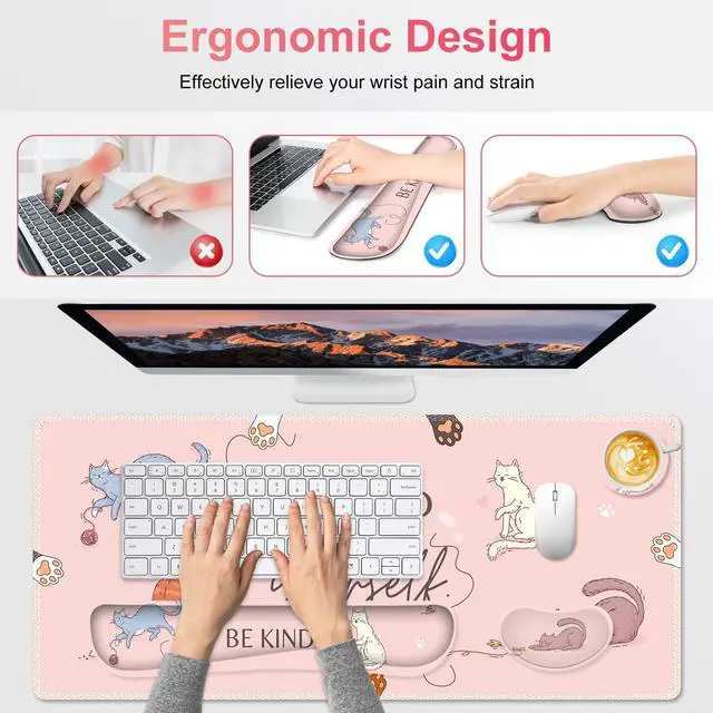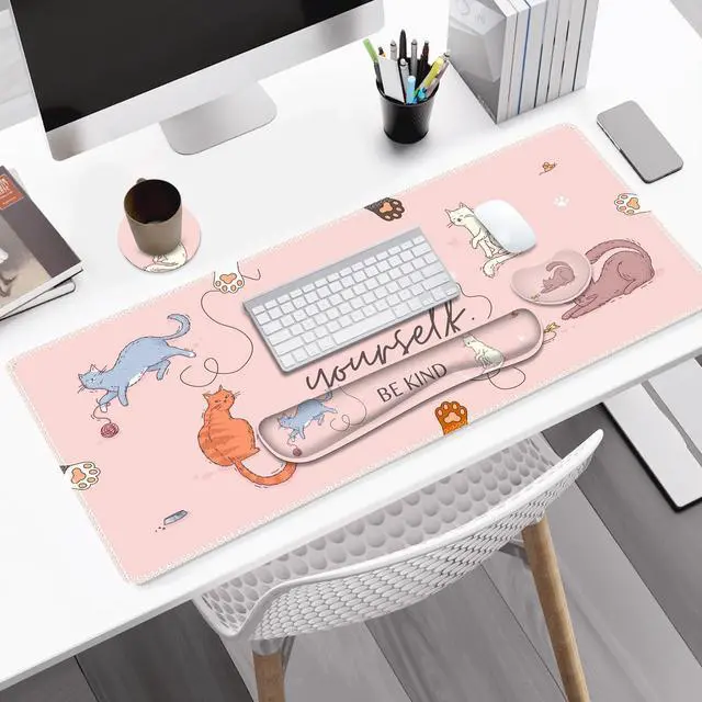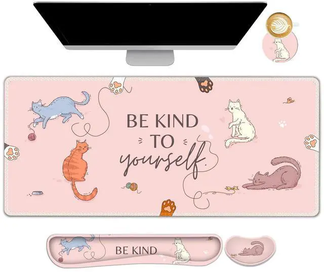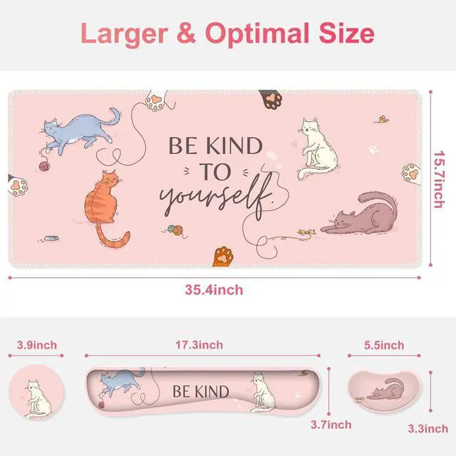 NXZGO Large Gaming Mouse Pad Set, Pink Cats Ergonomics Keyboard Desk Mat with Memory Foam Wrist Rest, Extended Game Mousepad, Non-Slip Desk Pad Matt Easy Typing Pain Relief I Be Kind to Yourself