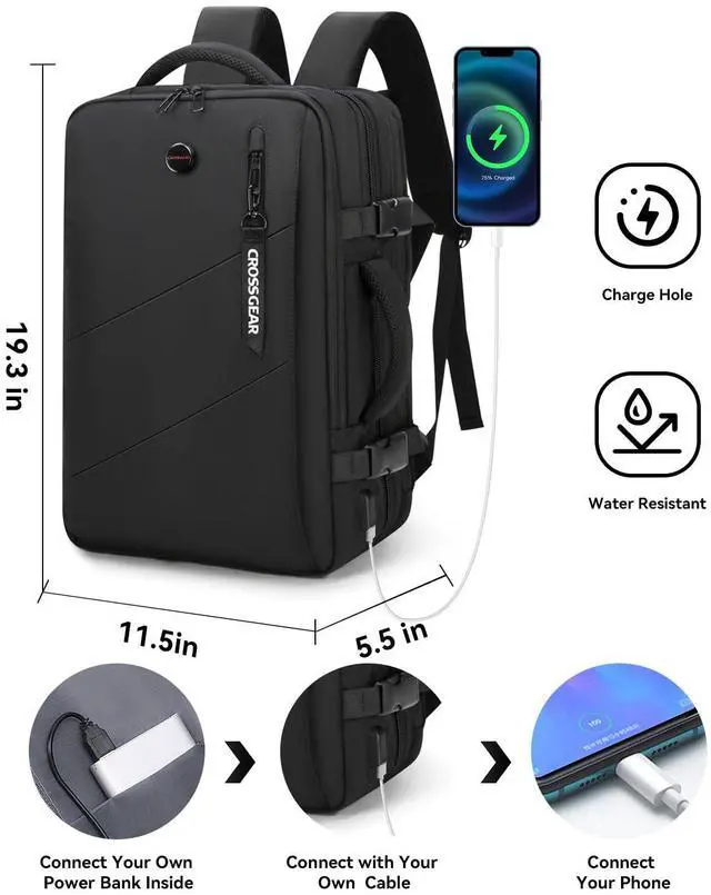 CROSSGEAR Expandable 25L-35L Travel Backpack, Weekender Carry-On Backpack for Airplanes, Water Resistant 17.3 Inch Laptop Backpack with USB Charging Port for Men - Black