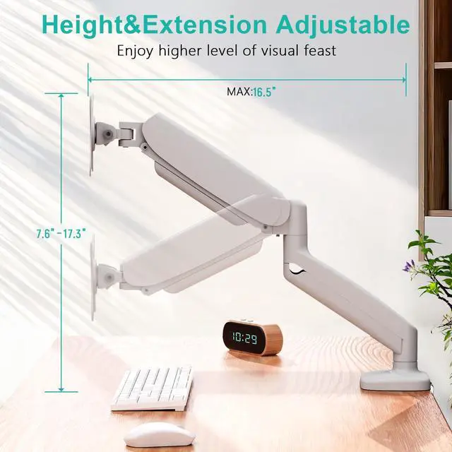 Full Motion Monitor StandFull Motion Monitor Stand: This single monitor arm offers a wide range of movement. Supports screen rotates 360° for landscape or portrait orientation, swivels 180° to share your display, and tilts up 90°/down 45° for better viewing. The arm can extend up to 16.5" long, and rise up to 17.3" in height. Easy to find the right viewing angle and position. Tension adjustment is based on the weight of monitor and the gas spring is pre-set to mid-tension, please adjust tension after hanging on monitor.