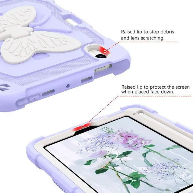 Shockproof Material: Our iPad Mini 7th A17 Pro/6th Generation butterfly kickstand case with pencil holder is made up of a hard PC on the front and a soft silicone cover on the back, providing full body protection against scratches, shocks, drops and impacts while doing no harm to the back of your iPad Mini 7th/6th 8.3"