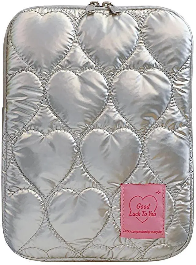 This tablet sleeve, in metallic bright color and heart shaped quilted puffer element, is a perfect choice for birthdays, holidays, or as a back-to-school essential.