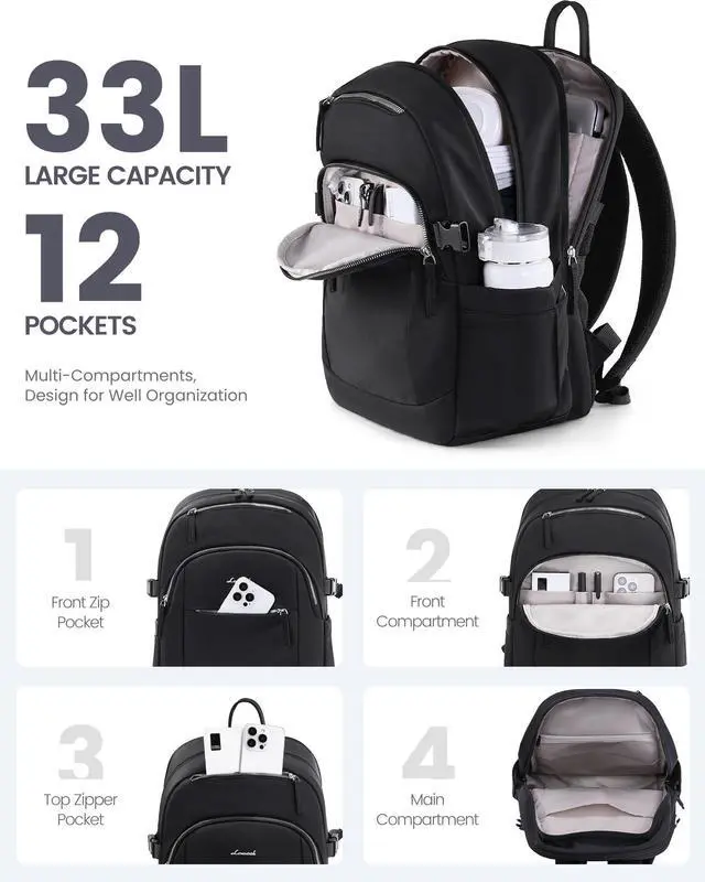 Spacious & Organized InteriorWith a generous 33L capacity, this laptop backpack offers ample space for 2 to 5 days' worth of clothing and daily essentials. Neatly organize essentials effortlessly with 12 pockets, while an oversized side pocket easily fits a 40 oz water bottle.
