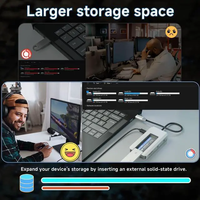 USB-C Hub with SSD Port - What to do if your laptop's memory is not enough? Installing an SSD is too cumbersome for a laptop? Then try our USB-C hub with SSD connection! It supports up to 10Gbps M.2 PCIe SSD (M-Key/B&M Key) and 6Gbps M.2 SATA (B&M Key) with 4TB capacity. Expand your computer memory as you like just use it!