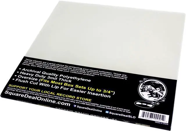 Fits most box sets up to 3/4" thick. Virgin 1st quality polyethylene. The sleeves are flush cut at the top. These are the record industry's sleeve of choice - the thickness provides maximum protection for your record collection - if these hold up and protect a record when in the store in many customer's hands then they definitely will keep your collection pristine!