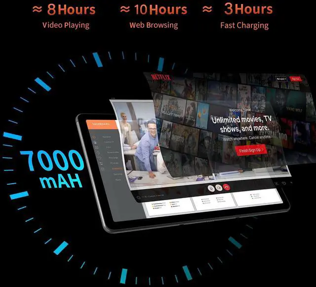 7000mAh Battery: The 10.4inchs tablet with a 7000mAh battery can meet the basic requirements of games, office work, and video calls. The smart PC tablet lasts for about 8 hours after a full charge, and it supports quick chargin