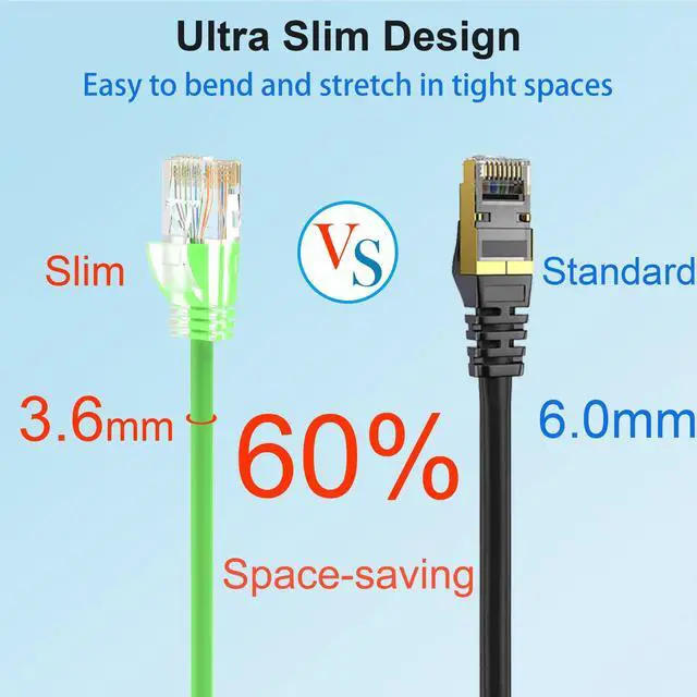 • Ultra Slim DesignSlim ethernet cable made of 28AWG pure copper. Slim cat6 patch cable is about 60% of standard ethernet cable thickness. Ultra-slim design make the cable to bend and stretch at will in tight spaces. The thickness of Cat 6 patch cable 3ft doesn't compromise the ability and provides reliable network transmission.
