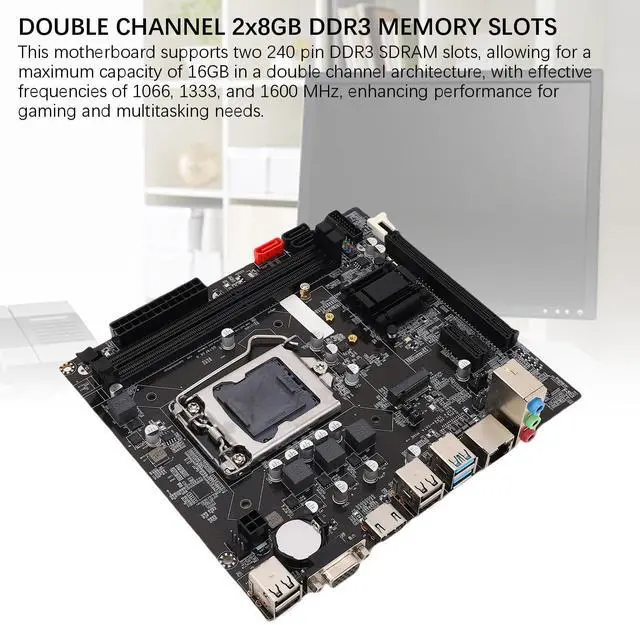Memory: 2 x 240 pin DDR3 SDRAM slots, Maximum memory support 16GB, Supports double channel DDR3 1066/1333/1600 MHz