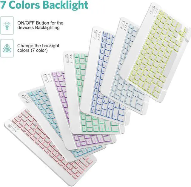 7-Color Backlit Bluetooth Keyboard - This backlit bluetooth keyboard has 7 switchable backlight colors, It helps you to type easily in the absence of light. The bluetooth keyboard adopts a scissors switch design, which allows you to have a comfortable and quiet typing experience and enhance your work or entertainment experience and fun.