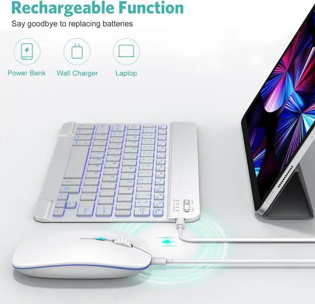 TECURS Bluetooth Keyboard and Mouse Combo for iPad, 7-Color Backlit Rechargeable Wireless Keyboard & Mouse Compatible with iPad 10th/9th/8th Gen, iPad Pro/Air/Mini and ipadOS 13 and Above (White Grey)