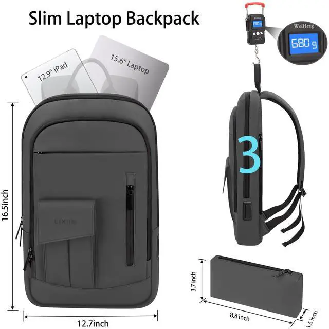 Perfect SizeThe size of the laptop backpack is 16.5*12*3in,and ONLY 1.5lb.(This lightweight business backpack is only for 15.6 inch laptop, Please check the SIZE before purchasing).This slim backpack also comes with an additional 8.8*3.7*1.5inch pouch.Lixiin waterproof backpack is suitable for work,commuting,traveling.This travel backpack is a gift for men/women!