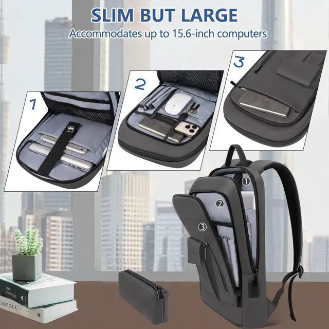 Fashion DesignMeticulously designed by our team, this slim mens backpack is truly one-of-a-kind.. In the front of the waterproof backpack there is a unique pouch designed for storing your data cable car keys headphones etc.. This anti-theft backpack features a unique hidden zipper design on the surface to protect your valuables.. The main compartment and the second compartment have multiple multi-functional pockets designed exclusively for storing small items.