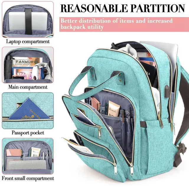Laptop Backpack for Women, High School Bookbag for Girls with USB Port Charging, 15.6 Inch Water Resistant Computer Bag for Work, Travel College Back Pack Purse Gifts for Student Teacher, Light Green