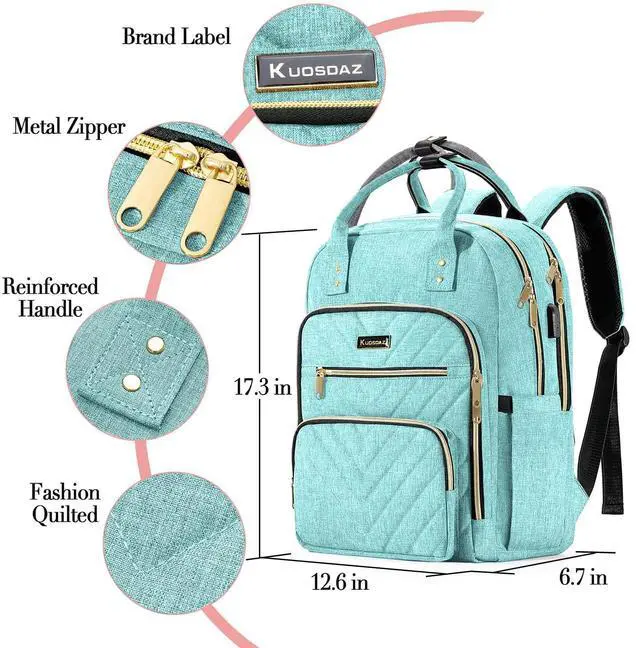 Large Backpack with Laptop Compartment: Kuosdaz laptop backpack for women. Size: 17.3*12.6*6.7 inch, 30L. The laptop backpack has a total of 5 compartments and 2 side pockets - 1 padded 15.6" laptop compartment and 1 large compartment for travel items such as folders, books, clothes, etc. 2 front compartments and 1 front pocket provide ample capacity for organizing - wallet, notebook, pens, sunglasses, keys and more.