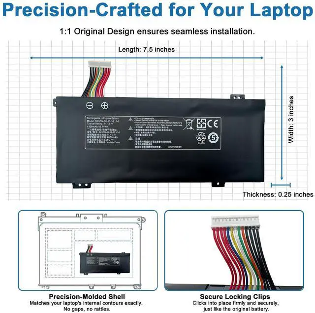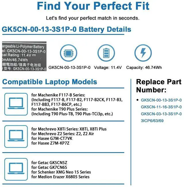 Battery Specifications Battery Type: Li-ion. Capacity: 46.74Wh 4100mAh. Voltage: 11.4V. WHAT YOU GET: 1 * GK5CN-00-13-3S1P-0 battery. 1 * User Manual. 4 * Screwdrivers.