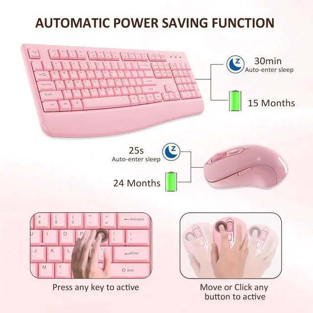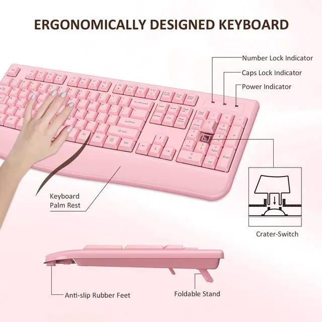 Wireless Keyboard and Mouse Combo, EDJO 2.4G Full-Sized Ergonomic Computer Keyboard with Wrist Rest and 3 Level DPI Adjustable Wireless Mouse for Windows, Mac OS Desktop/Laptop/PC (Pink)