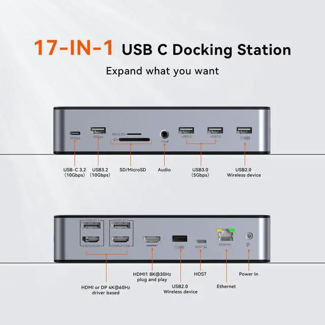 17 In 1 Powerful Workstation: This DisplayLink docking station features an impressive array of 17 ports, including: 3*HDMI, 2*DP, Gigabit Ethernet, 6 *USB ports(1*USB-A 3.2 10Gbps, 1*USB-C 3.2 10Gbps, 2*USB 3.0 5Gbps, 2*USB 2.0) for connecting high-speed USB peripherals, and SD/microSD card slots, 3.5 mm audio/mic port, a Power input port, and a Kensington lock. This triple monitor docking station can be built into a powerful workstation and boost your productivity with minimal hassle
