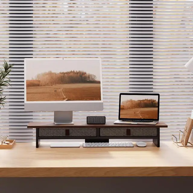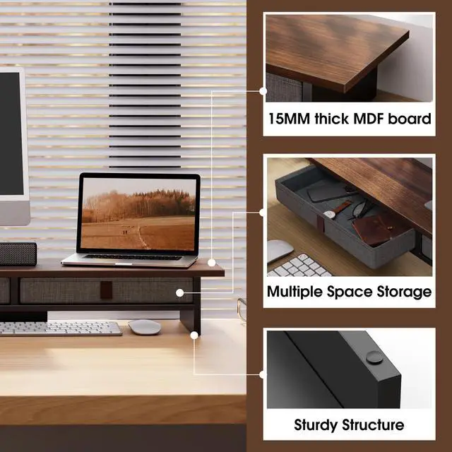 Extra Large WorkstationEquipped with 2 fabric drawers, this monitor stand effortlessly organizes cables, stationery, or office supplies, maximizing desk space while protecting privacy. The 2-tiers structure (35"x9.3") securely holds dual monitors, printers, or TVs, transforming cluttered desks into streamlined workstations.