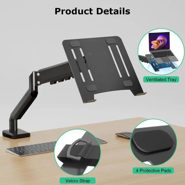 Full Motion Adjustable Laptop Mount The laptop arm mount offers ±45° tilt, 180°swivel, 360° rotation to provide you a more flexible, comfortable viewing angle and helping relieve strain on your spine, neck, and shoulders. Thanks to the built-in gas spring system,the laptop mount can be extended forward up to 19.7" and elevated to a maximum height of 16.34", making it a breeze to set your own comfortable workstation and switch