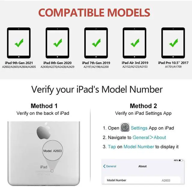 for iPad 10.2 Keyboard Case CompatibilityKeyboard case for iPad 9th generation 2021 (A2602/A2603/A2604/A2605), for iPad 8th generation 2020 (A2270/A2428/A2429/A2430), for iPad 7th generation 2019 (A2197/A2200/A2198), for iPad air 3 2019(A2152/A2153/A2123) and for iPad pro 10.5 2017 ( A1701/A1709/A1852). Please check your for iPad model before purchasing.