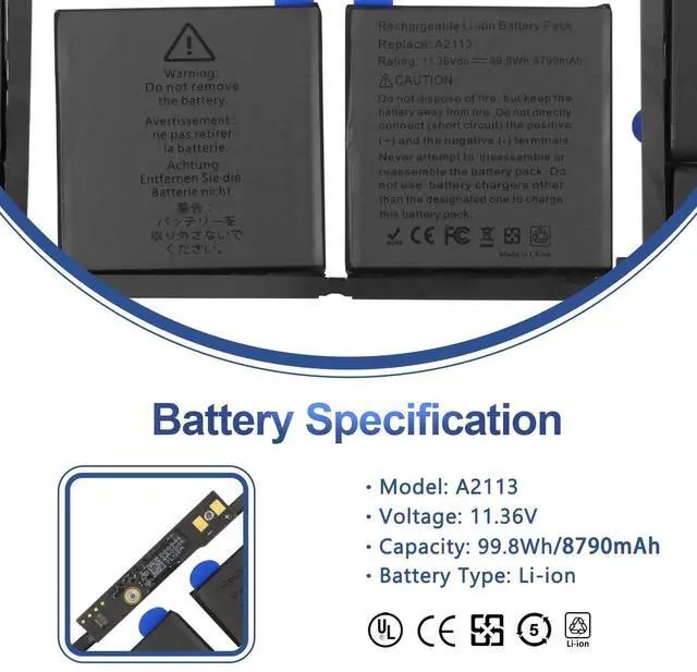 A2141 Battery Replacement, A2113 Battery for MacBook Pro 16 Inch A2141, Release 20192020, EMC 3347, MVVL2 MVVL2LL/A MVVM2 MVVM2LL/A MVVK2 MVVK2LL/A MVVJ2 MVVJ2LL/A 11.36V 99.8W h 8790mAh