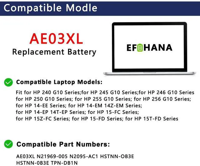 EFOHANA AE03XL Laptop Battery Replacement for HP 240 245 246 250 255 256 G10 Series Pavilion 14-EE 14-EM 14-EP 15-FC 15-FD N2095-AC1 HSTNN-OB3E N21969-005 11.25V 3467mAh/ 41.04W h 3-Cell