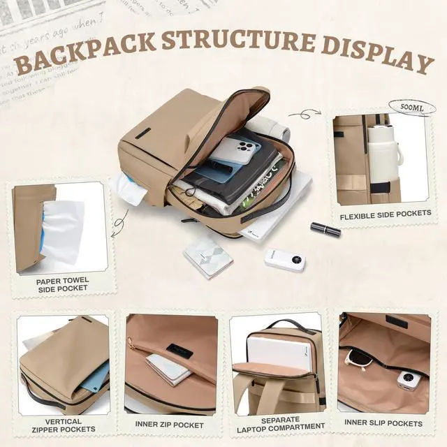 Spacious & Organized This 16L backpack features a roomy main compartment with an inner zipper pocket, 2 slip pockets, and a separate padded laptop compartment that fits up to a 15.6" laptop. External features include 2 front zippered pockets, 1 side pocket, 1 tissue side pocket, and 1 rear luggage strap for added convenience.