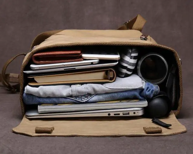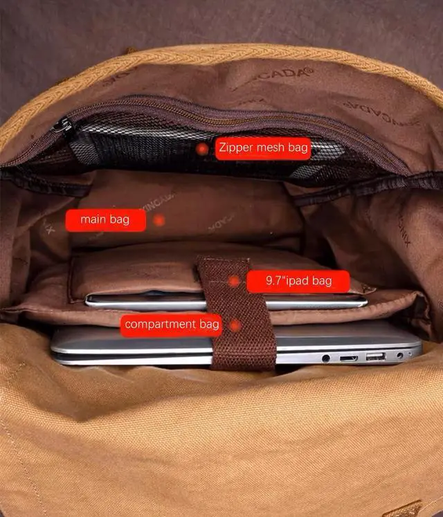 Multipurpose DesignThe canvas bag consists of 1 main pocket and 1 front zipper pocket. Inside the main pocket there are 1 zippered mesh pockets for your phone or wallet, and 1 compartment pockets for your laptop and 1 ipad pouch.