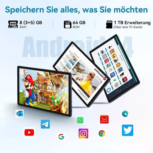 8 GB RAM + 64 GB ROM + 1 TB expandable: The Android 14 tablet 10 inch comes with 8 GB (3 GB + 5 GB expanded) RAM and 64GB of internal memory and supports expansion to up to 1TB (Micro SD not included) for faster streaming options, provide responsive gaming experiences and fast multitasking skills.