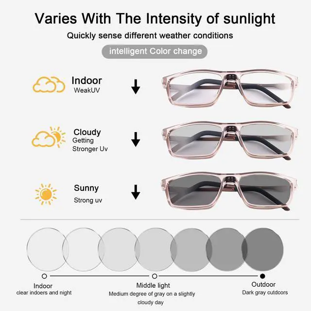 Smart photochromic material The magical photochromic material, when used outdoors, changes the transmittance of the lens with the intensity of ultraviolet rays. The transparent lens instantly turns into a light gray sunglasses lens.