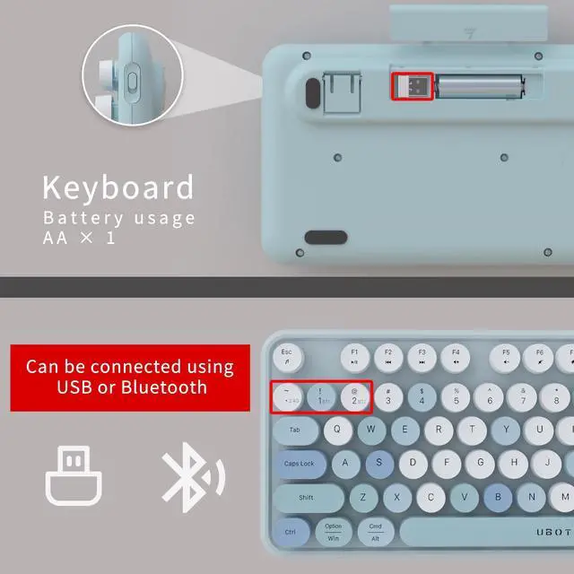 UBOTIE Dual Mode Colorful Wireless Keyboard, Bluetooth and USB Receiver Retro Typewriter Round Keycaps Keyboard Support Multi Devices for PC Laptop Tablet Phones(Blue Colorful)