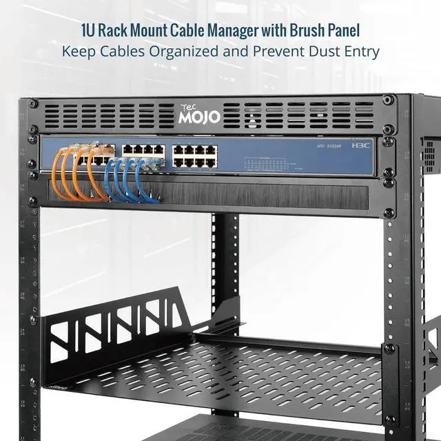 Ventilation and dust prevention:Cable manager with soft brush cable entry,maintains efficient airflow and prevents dust buildup,safeguarding your network equipment from overheating and dust damage